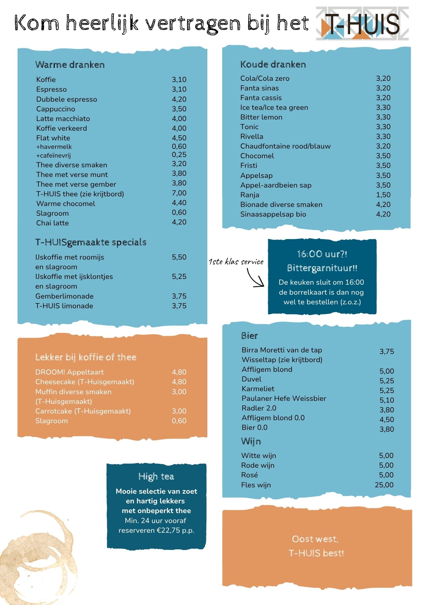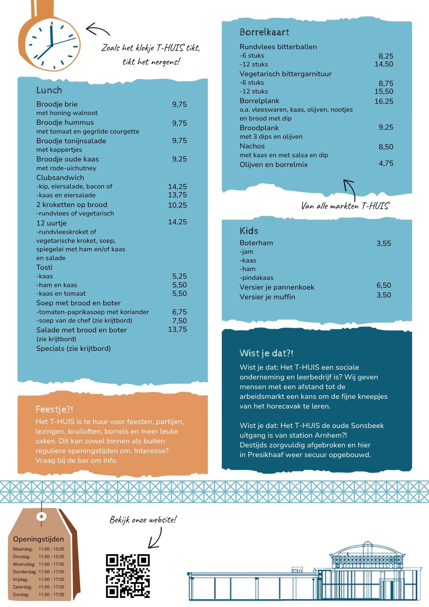 De combinatie met de Stadsboerderij maakt dat ook vele vaders, moeders, opa’s en oma’s het T-HUIS kunnen bezoeken met hun (klein)kinderen na een bezoek aan de boerderij. Zoals u kunt zien houdt de menukaart ook rekening met de jonge gasten.